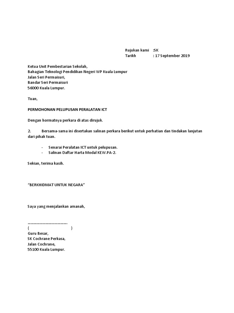 Contoh cara membuat surat resmi | contohsuratpediacontoh surat perjanjian kontrak rumah sederhana terbaru 2020yang baik dan tepat hallo sahabat. 6.3.1 selepas keputusan pb diperolehi, borang permohonan pelupusan fail (arkib 5/08) akan dilengkapkan dalam 3 salinan mengikut susunan berserta maklumat fail dan jenis pelupusan yang disyorkan. Surat permohonan daripada pemohon pelupusan aset alih secara serahan dikecualikan daripada perakuan pelupusan (pep) surat akuan penerimaan hendaklah dikemukakan beserta sijil pelupusan selepas aset diterima oleh pemohon kad pendaftaran bagi kenderaan yang dihadiahkan hendaklah. Bapak bupati indragiri hilir c.q kepala badan kepegawaian daerah kabupaten indragiri hilir di. Berikut kami berikan contoh surat penyerahan aset.